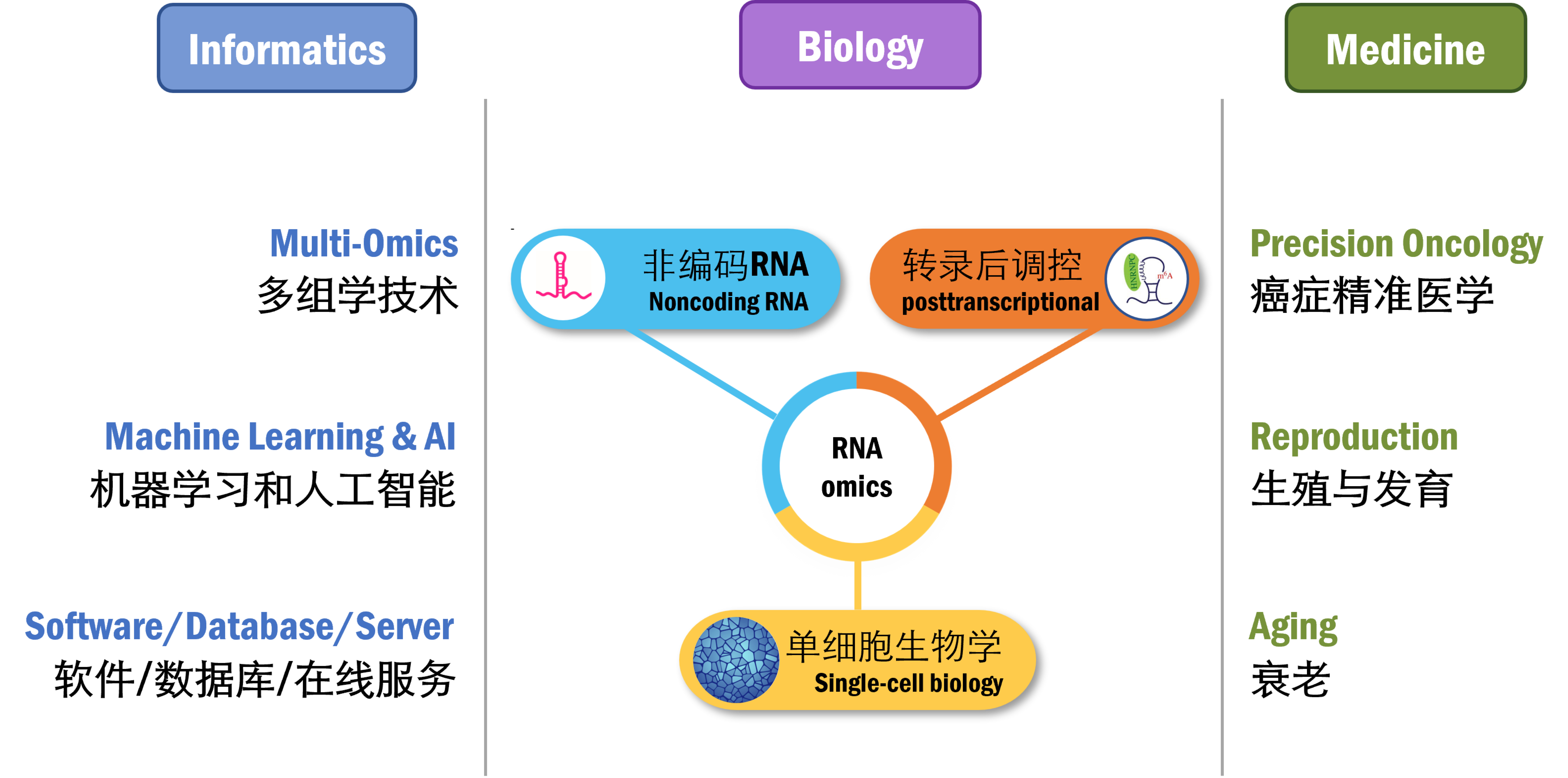 Our lab is broadly interested in RNA bioinformatics and genomics. Our research focuses on applying computational and statistical methods to elucidate biological questions in RNA regulation, especially those related to omics data, aiming to enhance the understanding of RNA regulation in complex traits or disease context. Major research topics of my group include: